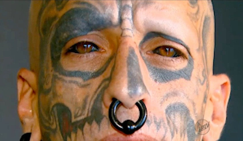 On na jednoj polovini glave ima istetoviranu vilicu, zube na obrazu, ali ono što je izrazito neobično je to što je njemu cela beonjača istetoviara i obojena u crno.