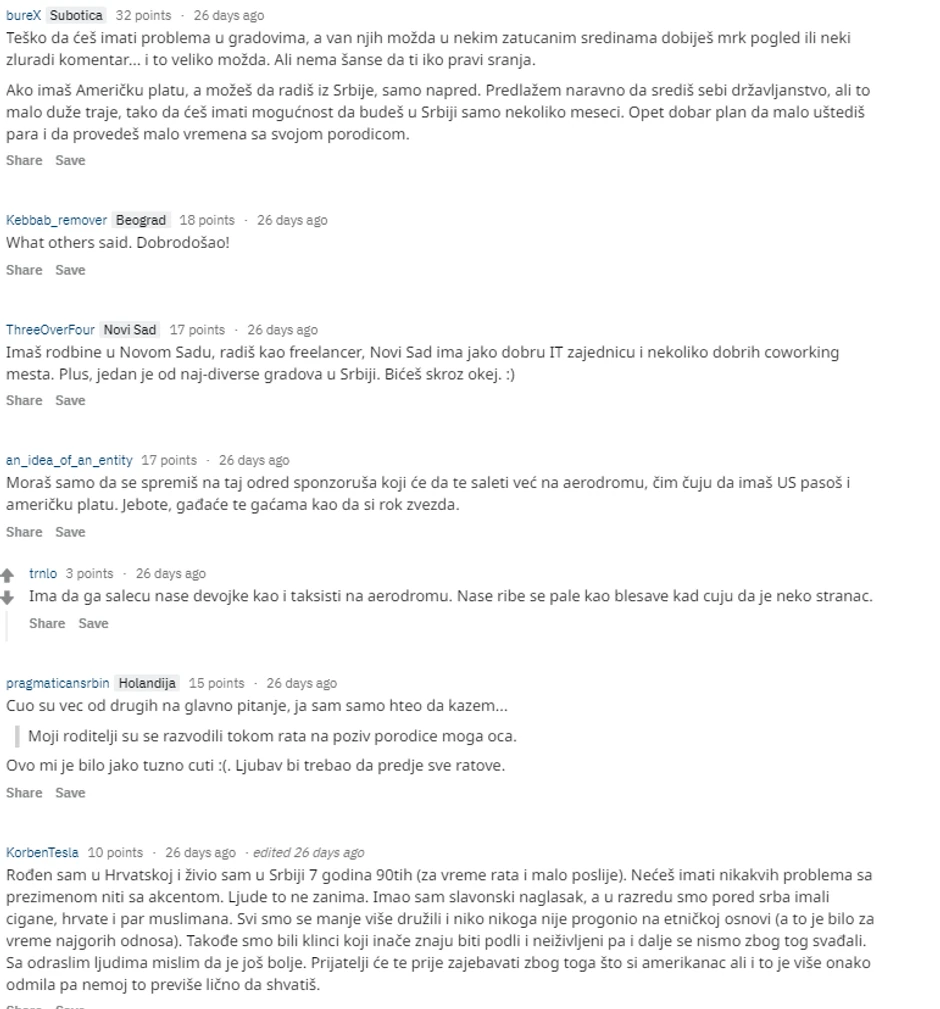 Jedna takva priča podeljena je na sajtu Reddit. Naime, mladić rođen u zajednici Srpkinje i Hrvata, poželeo je da se doseli na duže u Srbiju iz Amerike, a glavni strahovi su mu bili vezani za njegovo prezime i političke stavove.