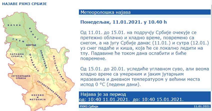 I na sajtu Republičkog hidrometeorološkog zavoda (RHMZ) se navodi da nas veoma hladno vreme očekuje od petka 15. do srede 20. januara.