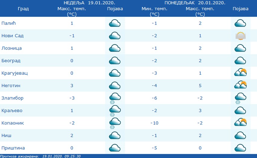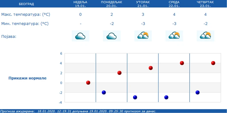 I sutra nas očekuje oblačno i tmurno vreme, ali bez padavina. Magla će biti prisutna tokom većeg dela dana, a temperature će se kretati od nula do četiri stepena. Šanse za nešto toplije vreme postoje u Timočkoj i Negotinskoj krajini, gde će biti povremenih sunčanih intervala.