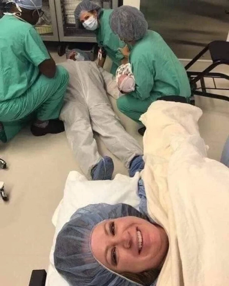Jedna mama je snimila selfi u porođajnoj sali neposredno nakon što je donela dete na svet. Usta je razvukla od uva do uva, još ima zaštitnu kapu na glavi, a u pozadini je njen muž, koji se upravo onesvestio.