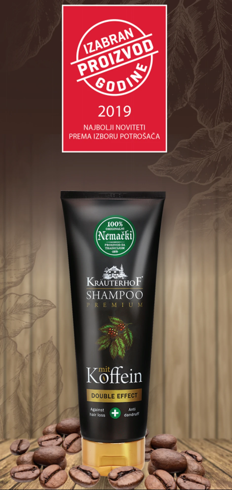 Upravo se kofein i ekstrakt zelenog čaja nalaze u dva proizvoda iz Kräuterhof kolekcije za negu kose: šamponu sa kofeinom i šamponu sa kofeinom duble effect. Osnova Kräuterhof šampona s kofeinom jeste aktivni kofen koji stimuliše teme i koren vlasi te podstiče rast kose. Osim kofeina, sadrži hijaluronsku kiselinu, ekstrakt zelenog čaja i fitokeratin koji obnavlja oštećenu površinu vlasi i sprečava njeno pucanje i lomljenje.