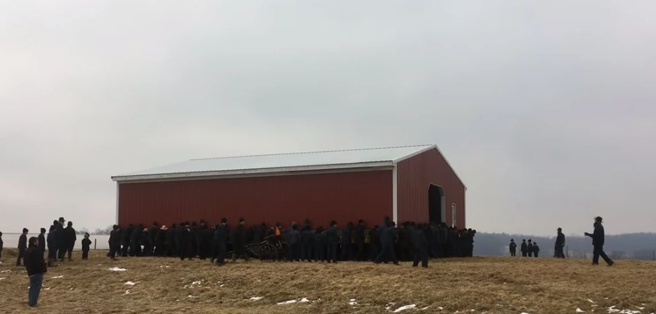 Video snimak nastao u amiškoj zajednici u Nokskaunti, u Ohaju, na farmi Džozefa Hošteflera, postao je viralan pošto se na njemu vidi kako su njih 250 ručno preneli ogromni ambar sa jedne tačke na drugu udaljenu čak 50 metara.