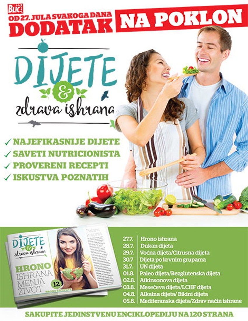 Od ponedeljka 27. jula kreće velika akcija “Dijete i zdrava ishrana” koja će vam kroz deset poklon dodataka ponuditi 15 mogućih načina da svoju liniju dovedete do savršenstva i da naučite kako zdravo da se hranite. Saznaćete sve o najpopularnijim dijetama uz stručno mišljenje nutricionista o prednostima i nedostacima svake od njih.