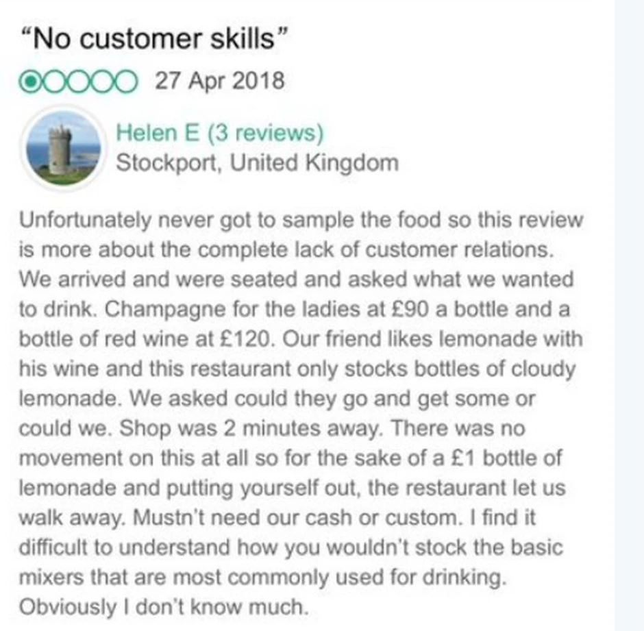 Žena koja se na Trip Advisoru potpisala kao Helen E. posetila je restoran Hispi u Mančesteru i nakon toga je ostavila prigovor na račun usluge koja ih je tamo dočekala.