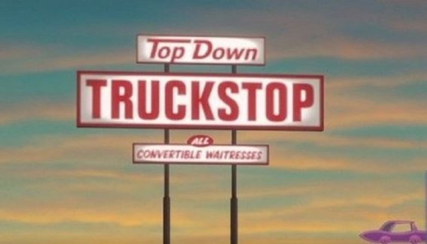 Dok automobili jezde autoputem, vidi se neonski znak za kamionsko stajalište sa natpisom: "Kabriolet konobarice".