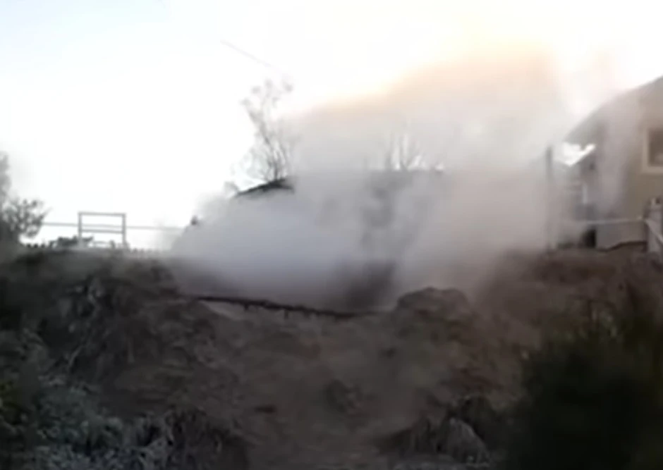 Strčala je u prizemlje kuće i videla da su prozori u njenoj kuhinji potpuno zamagljeni, a kad je izašla u dvorište imala je šta da vidi. Ogromni gejzir blata pojavio se u njenom dvorištu.