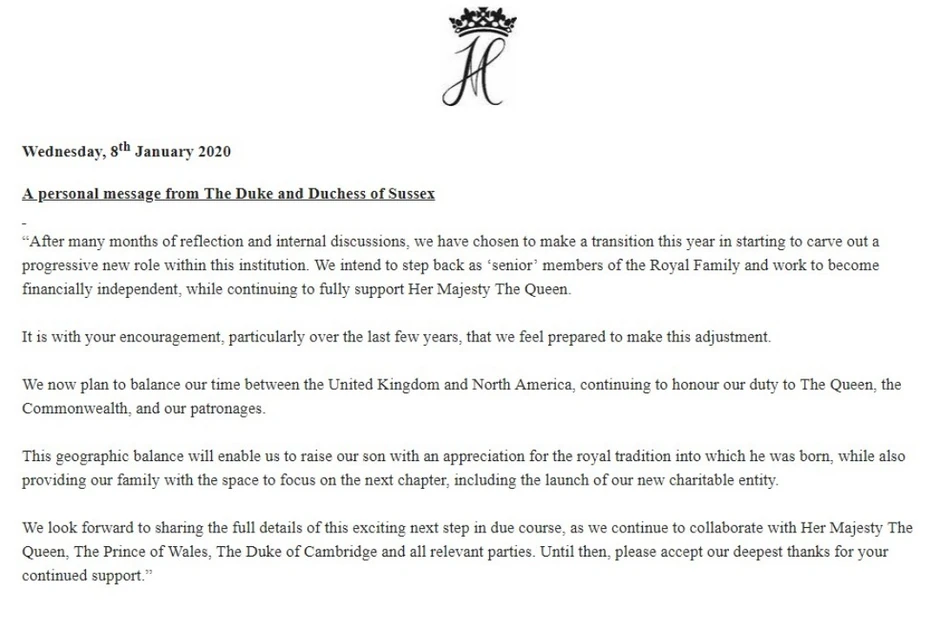 Uvodni deo saopštenja: navodi se da Hari i Megan žele da stvore sebi “progresivnu, novu ulogu u okviru ove institucije”.