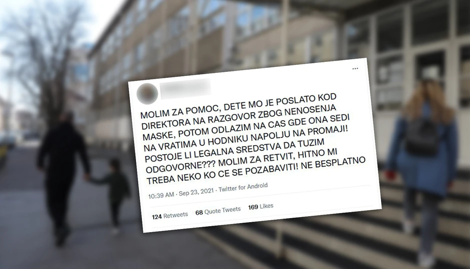"Molim za pomoć, dete mi je poslato na razgovor zbog nenošenja maske, potom odlazim na čas, gde ona sedi na vratima u hodniku, napolju na promaji. Postoje li legalna sredstva da tužim odgovorne? Molim za retvit, hitno mi treba neko ko će se pozabaviti. Ne besplatno", napisao je ovaj roditelj.