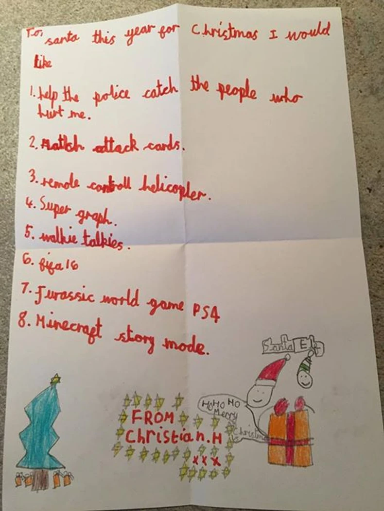 "Pomozi policiji da uhvati ljude koji su me povredili" bila je njegova prva želja na spisku. Osim toga,Kristijan je tražio i voki-toki i daljinski halikopter između ostalih stvari koje je naveo.