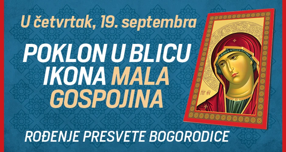 Srpska pravoslavna crkva u subotu, 21. septembra, slavi rođenje Presvete Bogorodice, praznik u narodu poznat kao Mala Gospojina. "Blic" u susret ovom velikom prazniku, u četvrtak, 19. septembra, svim čitaocima poklanja ikonu sa likom Device Marije.