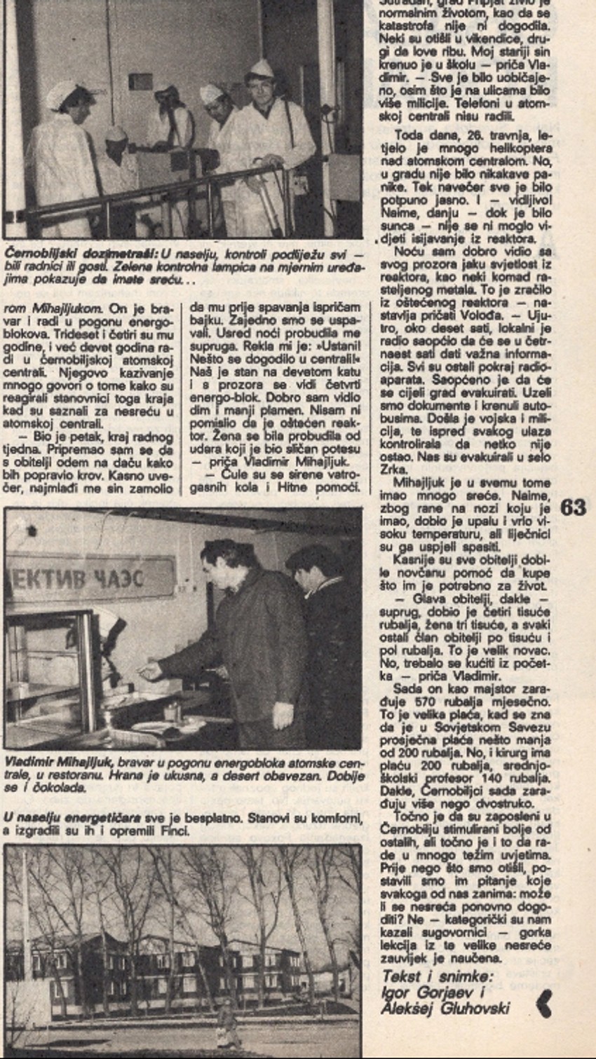 U selu energetičara sreli smo i razgovarali s Vladimirom Mihajljukom. On je bravar i radi u pogonu energo-blokova. Trideset i četiri su mu godine i već devet godina radi u černobilskoj atomskoj centrali. Njegove reči mnogo govore o tome kako su reagovali stanovnici toga kraja kad su saznali za nesreću u atomskoj centrali.