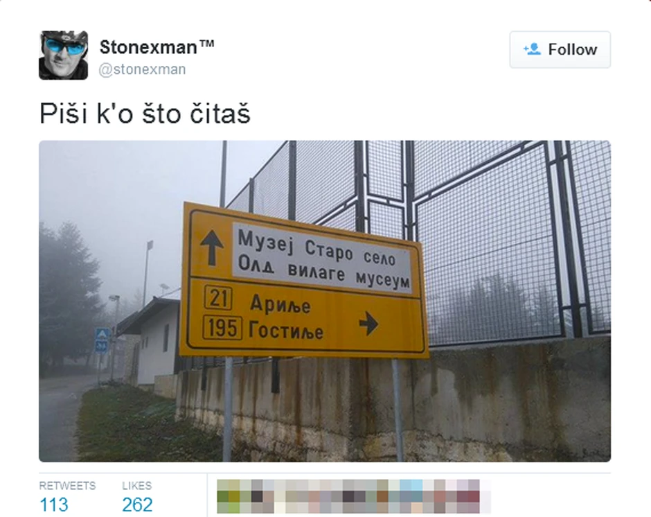 U selu Sirogojno na saobraćajnoj tabli osim putokaza na srpskom koji pokazuje smer u kom treba da se ide da bi se došlo do muzeja Staro selo, postoji i natpis na "engleskom", ali su umesto latiničnih korišćena ćirilična slova.