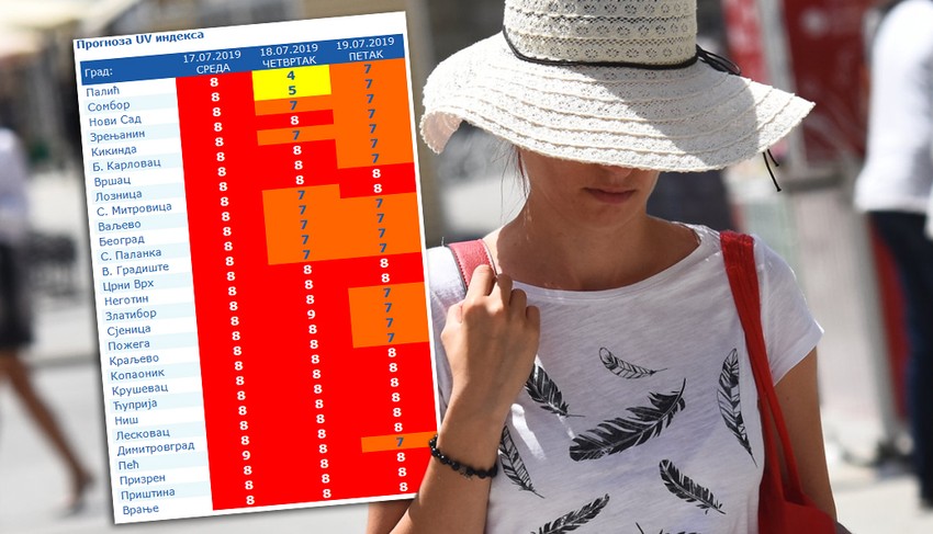 Republički hidrometeorološki zavod (RHMZ) izdao je za crveno upozorenje u celoj Srbiji na opasnost od ultraljubičastog zračenja, a lekari savetuju da iz kuće ne treba izlaziti bez šešira i nanete zaštitne kreme, kao i da treba izbegavati boravak na otvorenom u najtoplijem delu dana od 11 do 17 sati.