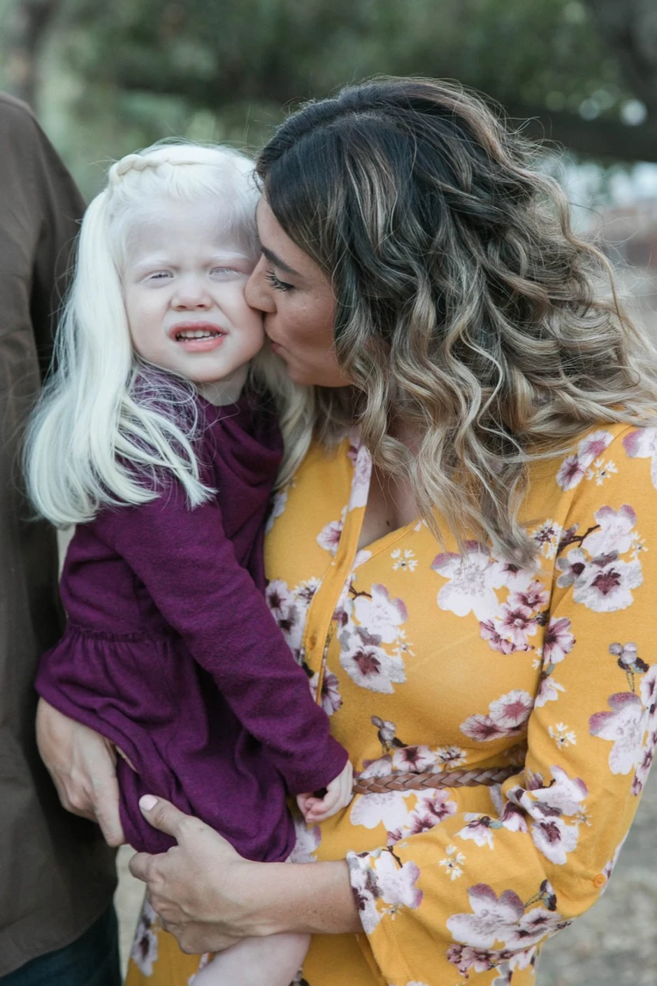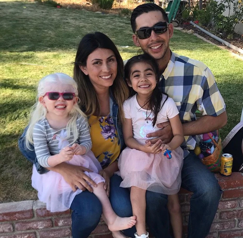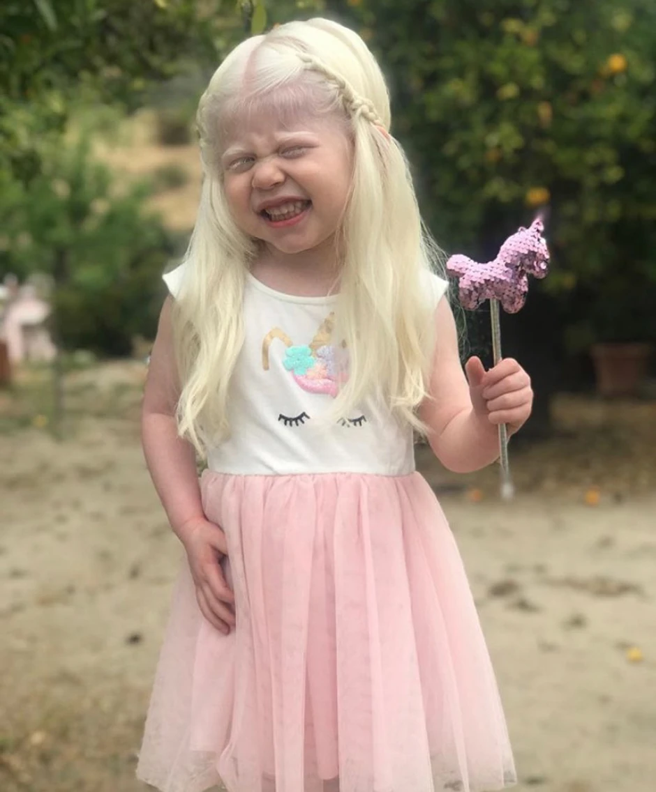 Iako su joj roditelji tamnije puti sa crnom kosom i tamno smeđim očima, devojčica ima gotovo belu kosu, svetle je puti i plavih očiju.