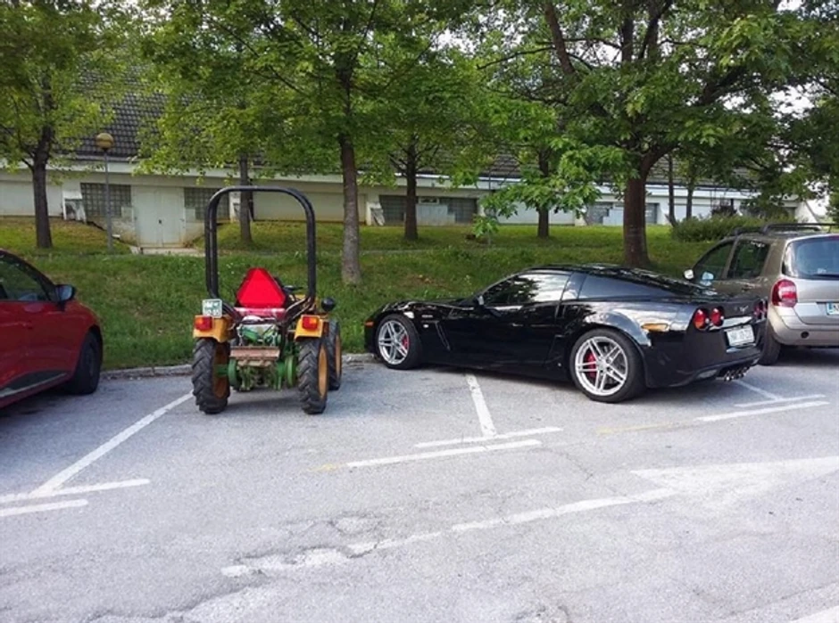 Fotografija s jednog parkinga u Sloveniji prikazuje omanji traktor i bahato parkiranu "Korvetu" pored njega.