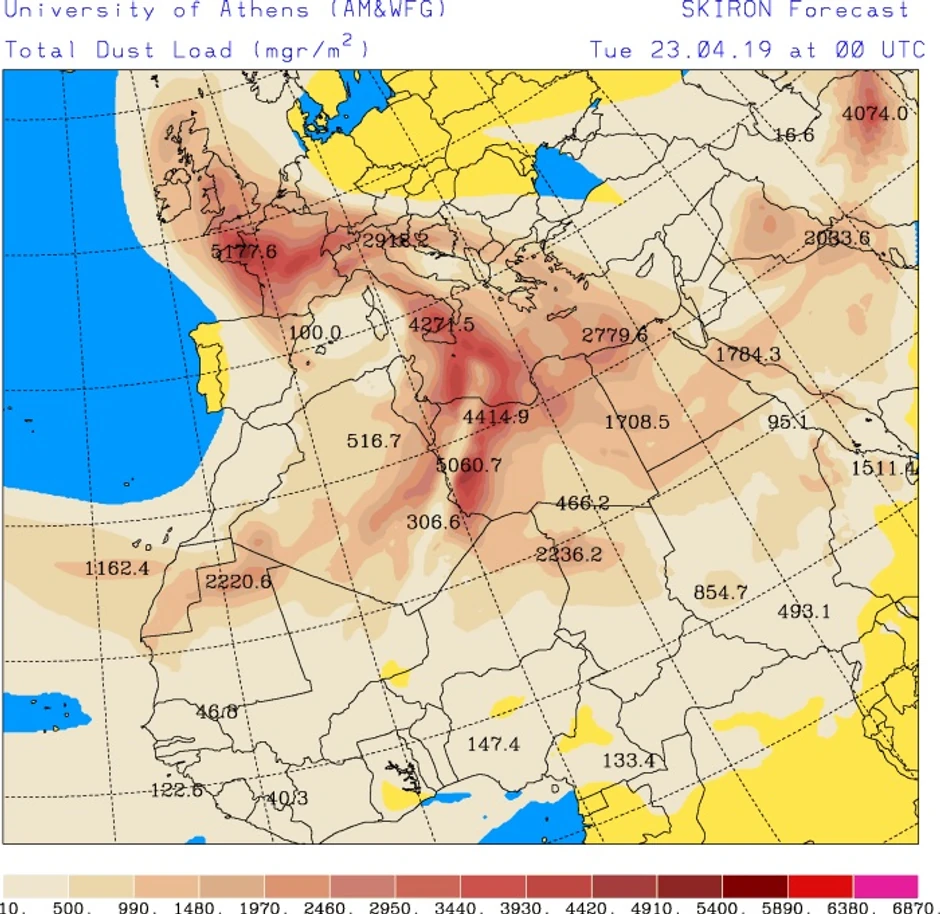 Gusta prašina će se do srede verovatno pomeriti na severoistok i istok, čak do Poljske, Ukrajine, Turske i Kipra.