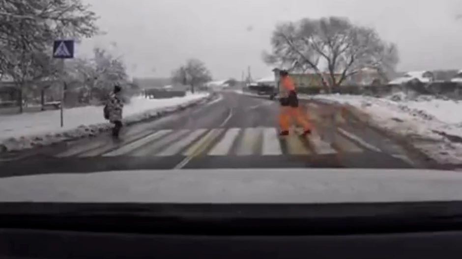 Dete i čovek su prelazili pešački sa suprotnih strana. U jednom trenutku čovek pritrčava detetu, grabi ga i brzo nosi na trotoar. U deliću sekunde bahati vozač proleće baš tamo gde je dete stajalo.