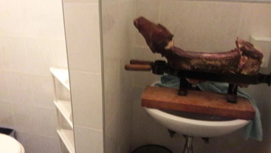 Videvši pršut u toaletu, šokirani zaposleni napravili su fotografije i upozorili vlasnika na neprimerenost čuvanja pršuta u sanitarnom čvoru. Međutim, vlasnik je odbio primedbe.