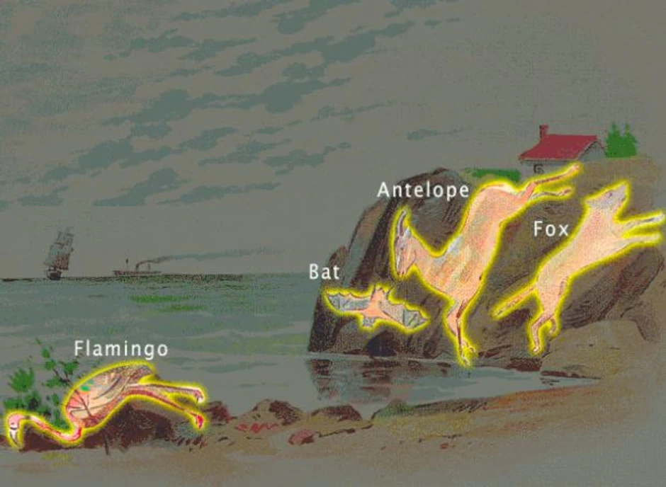 Na slici se kriju četiri životinje, a na vama je da ih pronađete. Lisica, slepi miš, flamingo i antilopa uživaju na suncu, samo treba da ih uočite.