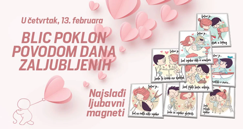 Proslava Dana zaljubljenih ove godine počinje malo ranije! "Blic" vam poklanja u četvrtak, 13. februara magnete sa ljubavnim porukama koji će vam izmamiti osmeh na licu!