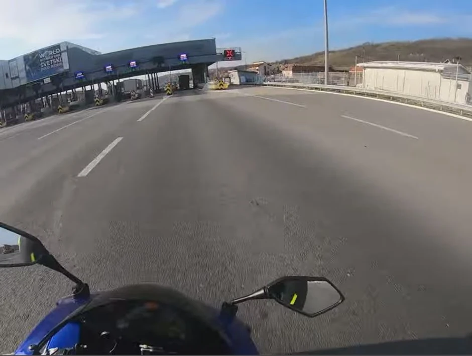 Snimak anonimnog muškarca, podeljen na Jutjubu prikazuje vozača motocikla koji u punoj brzini juri prema prolazu iznad kojeg stoji oznaka da trenutno nije u funkciji, ne mareći za plaćanje, niti policiju koja stoji odmah iza rampe, ali ni za radnike koji često pretrčavaju između različitih prolaza.