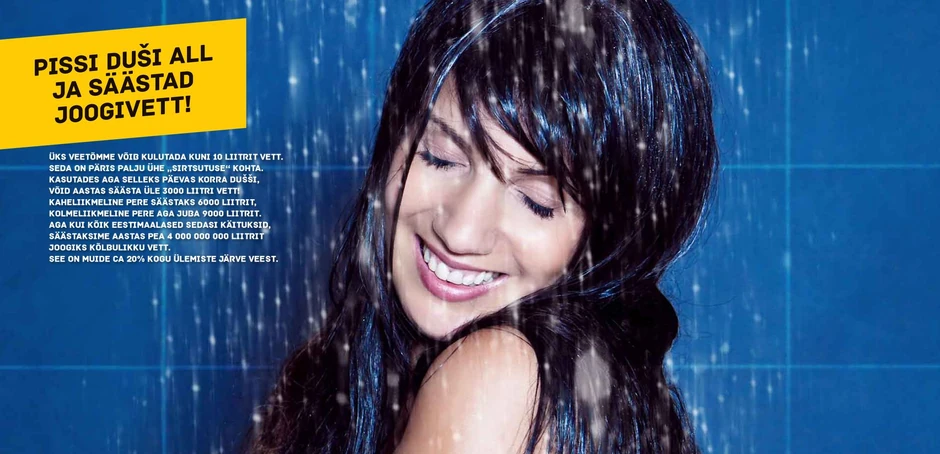 Na reklamnim panoima, kao i na sajtu ove reklamne kampanje, navodi se da bi Estonci mogli da uštede velike količine vode za piće ukoliko bi spojili uriniranje i tuširanje. U kampanji pod nazivom "Piški dok se tuširaš" navodi se da bi tako svaki Estonac mogao godišnje da uštedi 3.000 litara vode. Kada bi svi Estonci poslušali ovaj apel, godišnja ušteda bi bila četiri milijarde litara vode, što je petina količine vode u jezeru Ulemiste, najvećeg jezera u okolini Talina, koje je i najveći deo sistema za snabdevanjem vodom Talina.