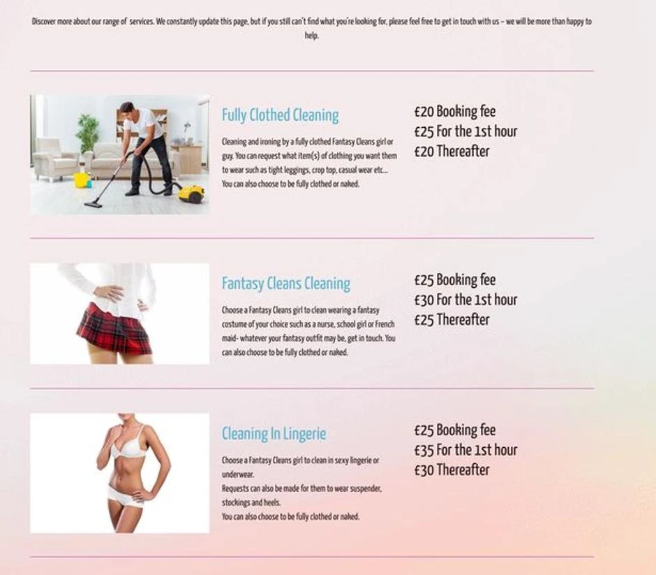 U oglasu se nudio posao koji se plaća između 25 i 50 funti po satu. Ispod fotografije plavuše koja na sebi ima samo donje rublje i rukavice i koja malom četkom čisti pod, piše "vi se opustite dok one obavljaju prljavi posao. Srećni smo jer možemo da ispunimo vaše zahteve".