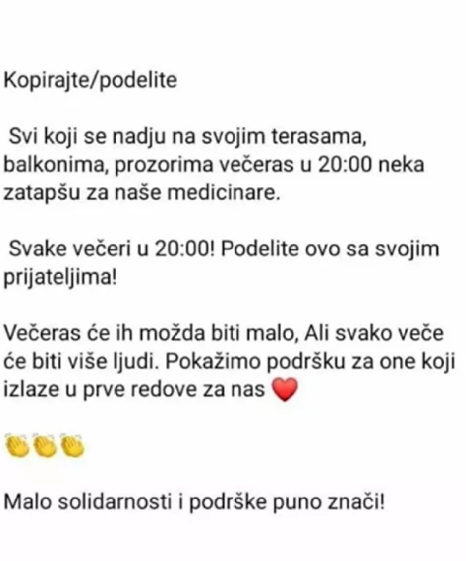 "Svake večeri u 20.00 časova. Podelite ovo sa svojim prijateljima! Večeras će ih možda biti malo, ali svake večeri će biti sve više ljudi. Pokažimo podršku za one koji izlaze u prve redove za nas. Malo solidarnosti i podrška puno znači!", navedeno je u objavi koja kruži društvenim mrežama, prenosi RTS.