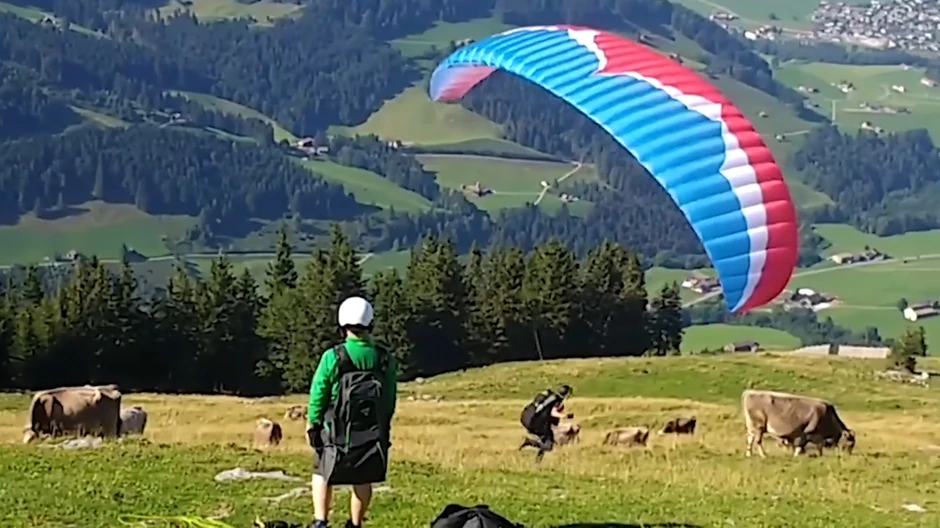 Ovaj adrenalinski zavisnik uspeo ja da, hvatajući zalet kako bi se vinuo svojim paraglajderom u oblake, udari u kravu koja je mirno pasla na livadi... Švajcarac je očigledno loše procenio pravac i snagu vetra i umesto u vazduhu završio na zemlji.