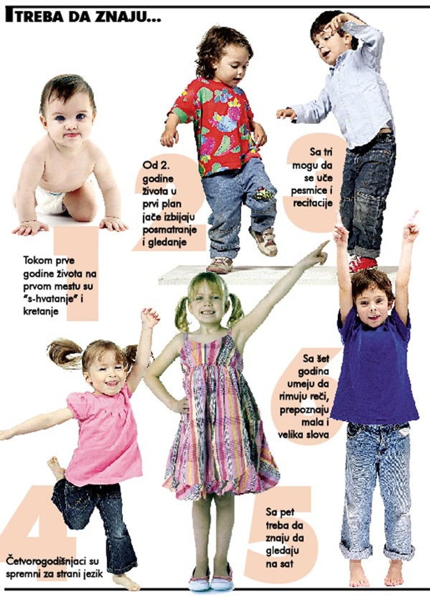 Sa pet godina imaju kontrolu nad svojim emocijama i razvijenu vezu mišljenja i govora. Ovo je idealno vreme da ih naučite da gledaju na sat. Sada već razaznaju brojeve pa će lako odgonetnuti koliko je sati na digitalnom satu, ali bi bilo dobro da ih naučite da odrede vreme i na satu sa kazaljakama. Sa šest godina morali bi jasno da razlikuju realnost i maštu. Trebalo bi da razlikuju slova velika i mala, brojeve do 20 i neke najvažnije znake interpunkcije. Morali bi i da znaju koji je broj veći, a koji manji, šta je kasnije, a šta ranije.