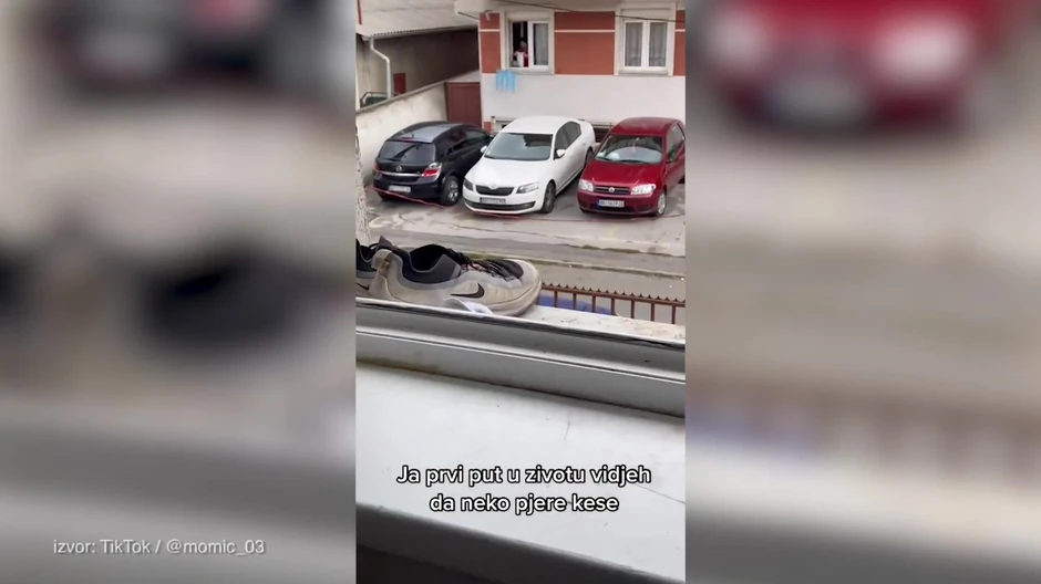 "Šta radi bre ova žena", rekao je on u šoku dok je snimao baku kako kači oprane kese na sušilicu za veš zgrade u kojoj živi.