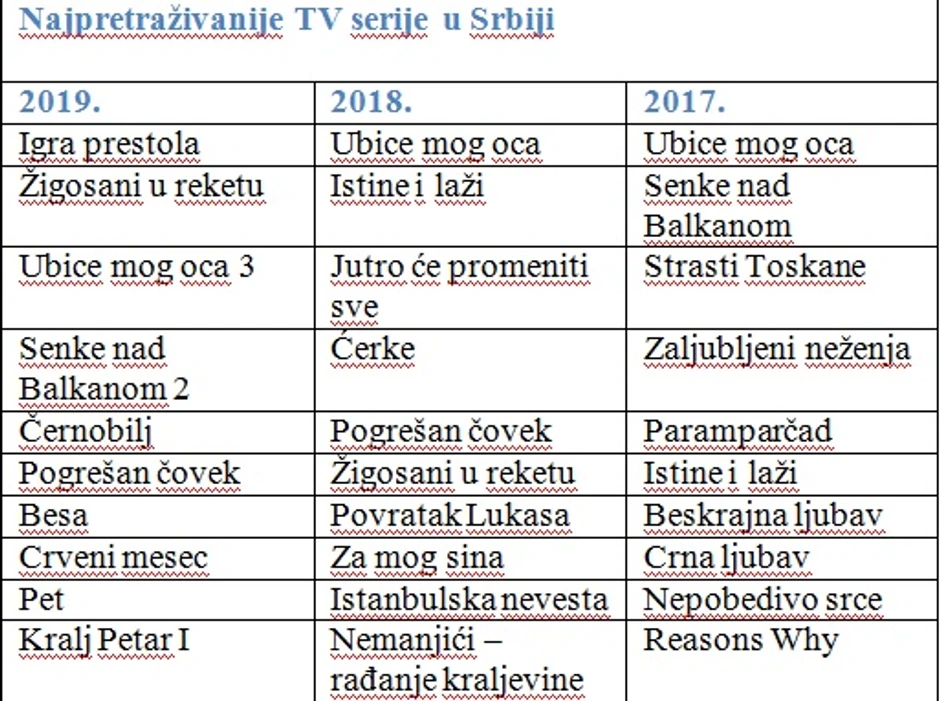 Prvih pet mesta na listi najtraženijih televizijskih serija zauzeli su “Igra prestola”, “Žigosani u reketu”, “Ubice mog oca 3”, “Senke nad Balkanom 2” i “Černobilj”.