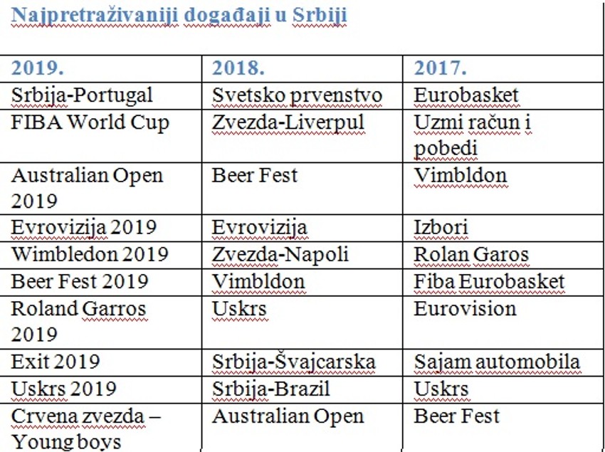 Među događajima su se na prvih pet mesta liste našla uglavnom sportska dešavanja – “Srbija-Portugal”, “FIBA World Cup”, “Australian Open 2019” i “Wimbledon 2019”, kao i jedan zabavni – “Evrovizija 2019”, a na dužoj listi od 10 najpretraživanijih dešavanja našli se i Bir fest, Exit i Uskrs.