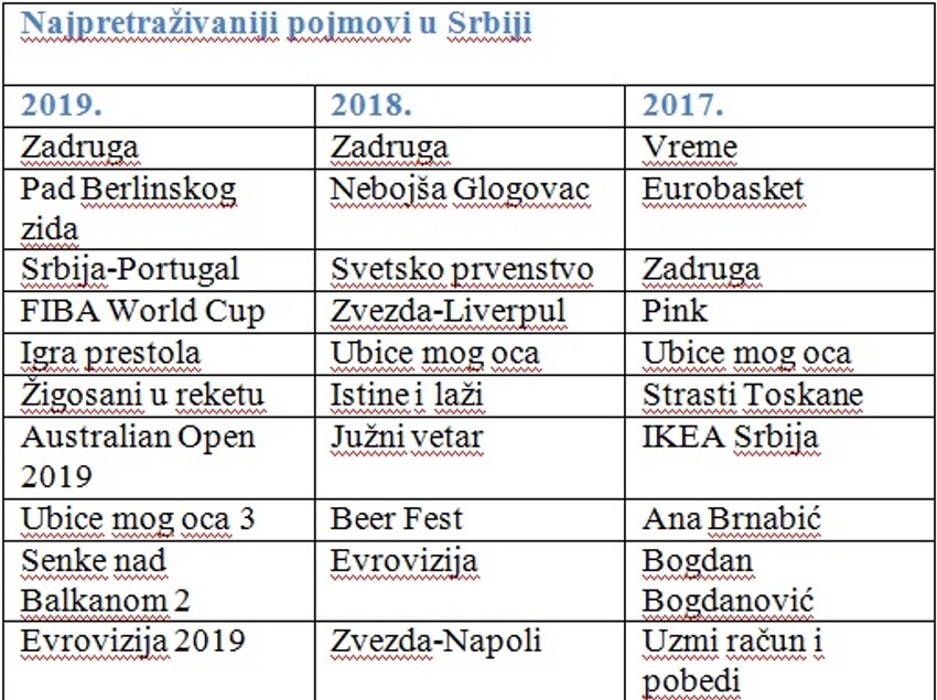 Rezultati – stavljeni u kategorije “najpretraživaniji pojmovi”, “događaji” i “TV serije” – pokazuju da među pojmovima vode “Zadruga”, “pad Berlinskog zida” i “Srbija-Portugal”, slede “FIBA World Cup” i “Igra prestola”.