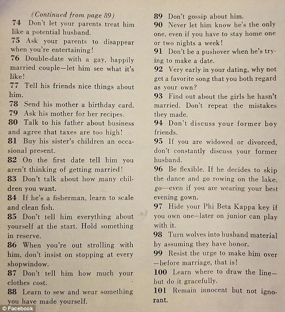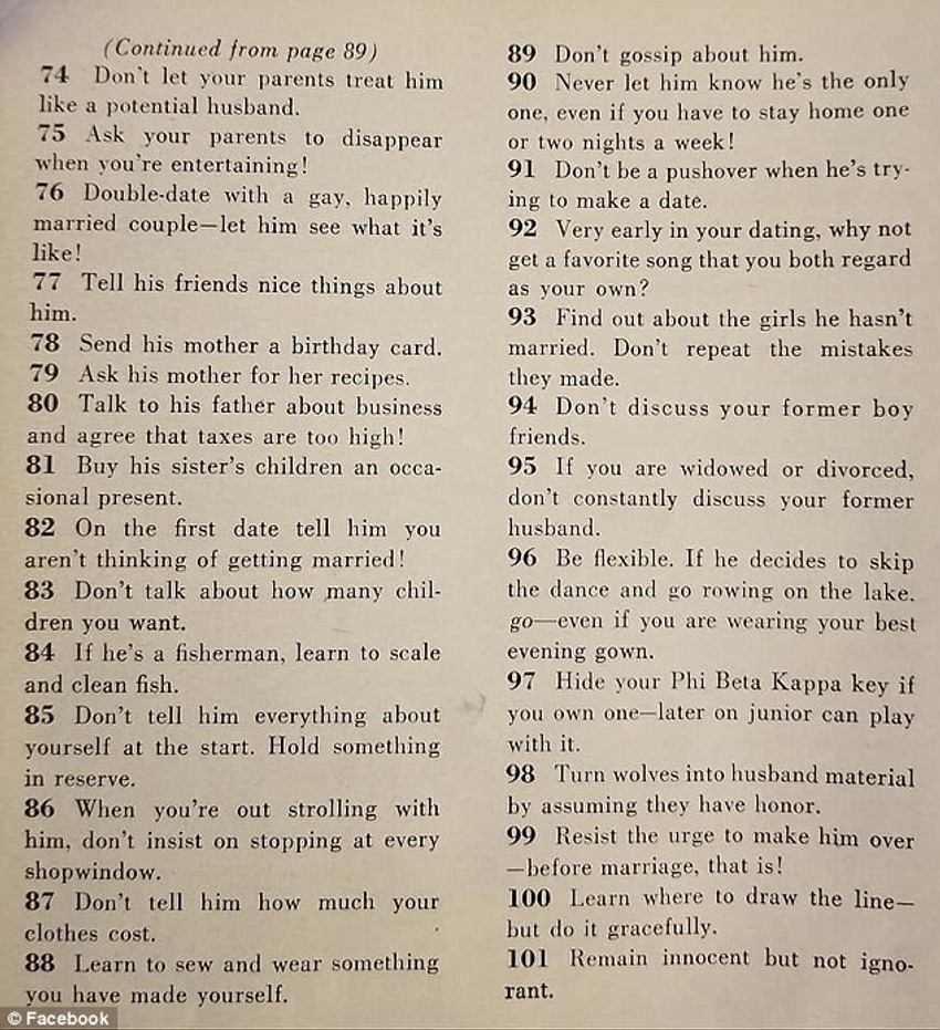 Ženama takođe savetuju da se podvrgnu dijeti, "ako je potrebno", da se oblače drugačije nego druge devojke, i da "nikada ne kukaju".