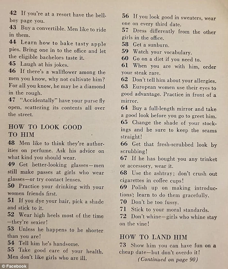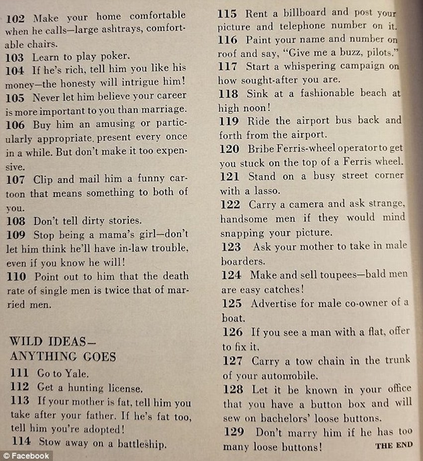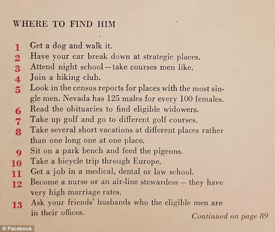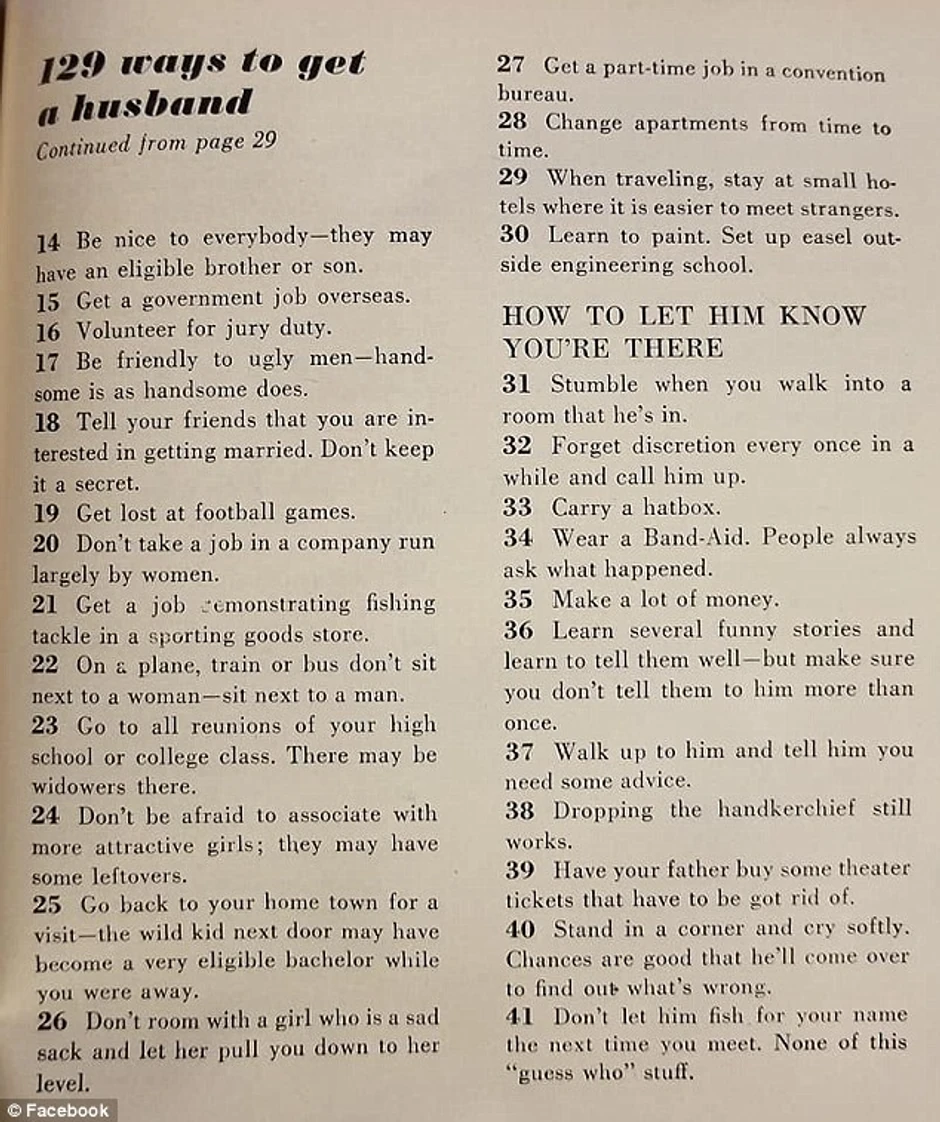 Članak pod naslovom "129 načina da nađete muža", objavljen 1958. u američkom časopisu "McCall's", sadrži bogat asortiman različitih saveta, od kojih je većina seksistička, a neki su zaista bizarni.