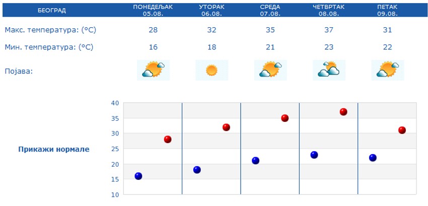 Kako se navodi u saopštenju, sutra i narednih dana vrlo toplo, sa najvišom dnevnom temperaturom od 34 do 38 stepeni, samo će u četvrtak i petak na severu i zapadu zemlje uz vise oblačnosti biti malo prijatnije. Vetar slab do umeren južni i jugozapadni. Sutra će se jutarnja temperatura u Srbiji kretati od 13 do 22 stepena, dok će najviša dnevna biti od 33 do 36 stepeni. I u Beogradu sutra sunčano i veoma toplo, a najviša dnevna oko 35 stepeni.