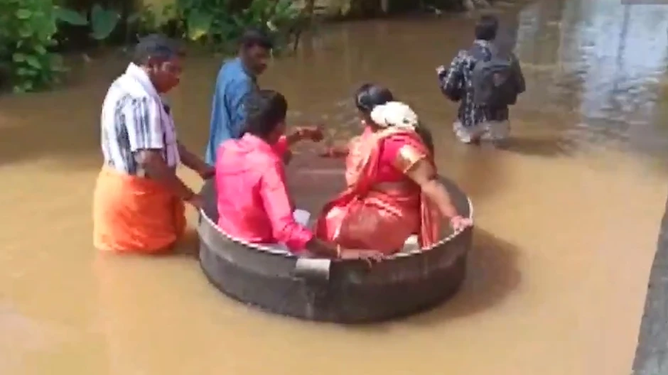 Jedan indijski par došao je na sopstveno venčanje ploveći u ogromnom loncu, jer su ulice njihovog gradića Talavadija bile poplavljene.