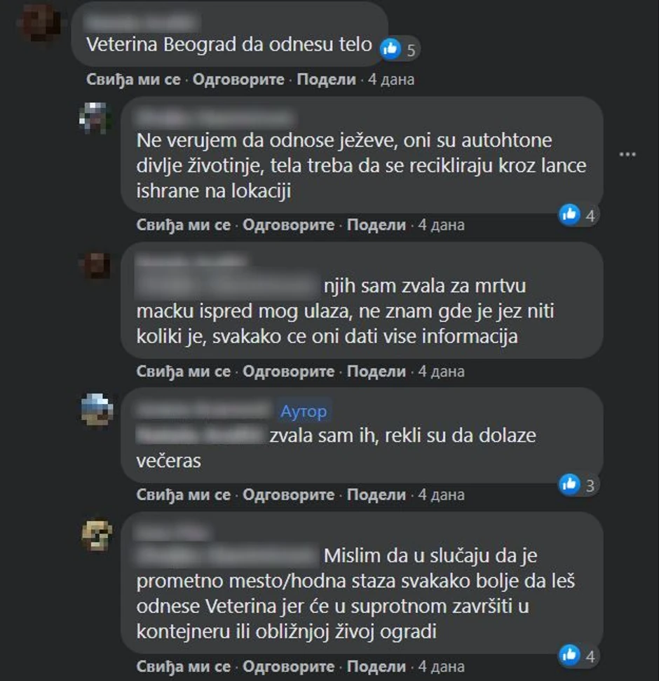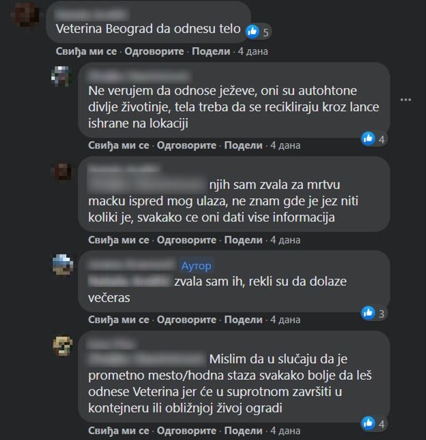 "Ne verujem da Veterina Beograd odnose ježeve, oni su autohtone divlje životinje, treba da se recikliraju kroz lance ishrane na lokaciji", "ostavi ga u šumi ili gde je već, ona će se postarati ze telo. To je cela ideja prirode. Mada 'šume' u okviru grada tehnički više pripadaju 'kulturi/društvu', nego konceptu 'prirode'", naveli su oni koji su naišli na ovu objavu.
