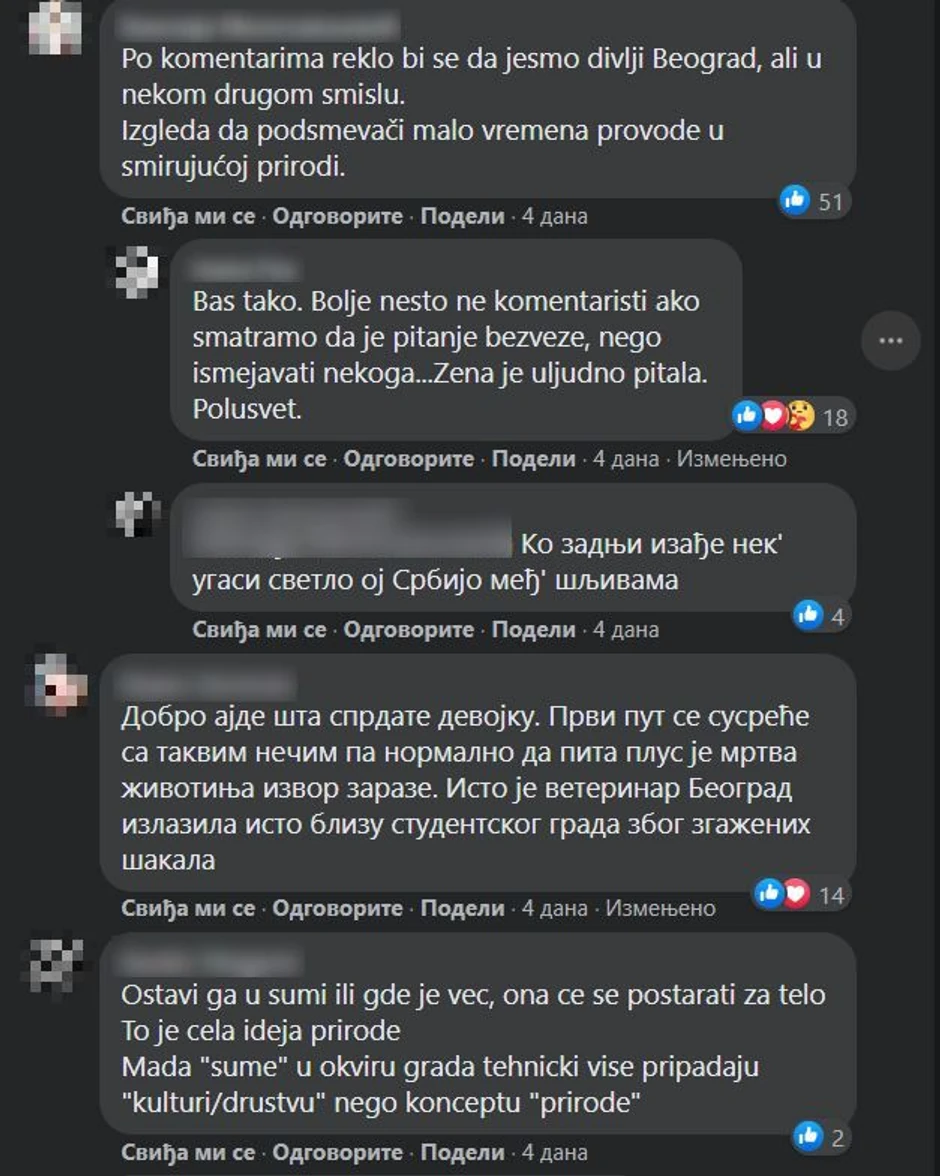 "Po komentarima bi se reklo da jesmo divlji Beograd, ali u nekom drugom smislu. Izgleda da podsmevači malo vremena provode u smirujućoj prirodi", napisala je jedna korisnica Fejsbuka.