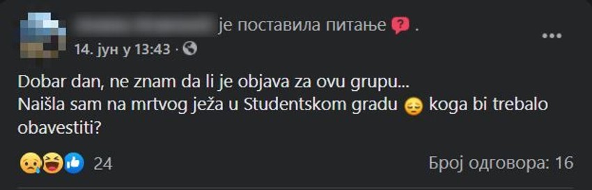 Jedna devojka je naišla na takvu nedoumicu kada je u Studentskom gradu naišla na uginulog ježa. Zbog toga je odlučila da se obrati članovima Fejsbuk grupe "Divlji Beograd". Pre nego što je dobila bilo kakav konstruktivan odgovor, naišla je na podsmehe, piše "Telegraf".