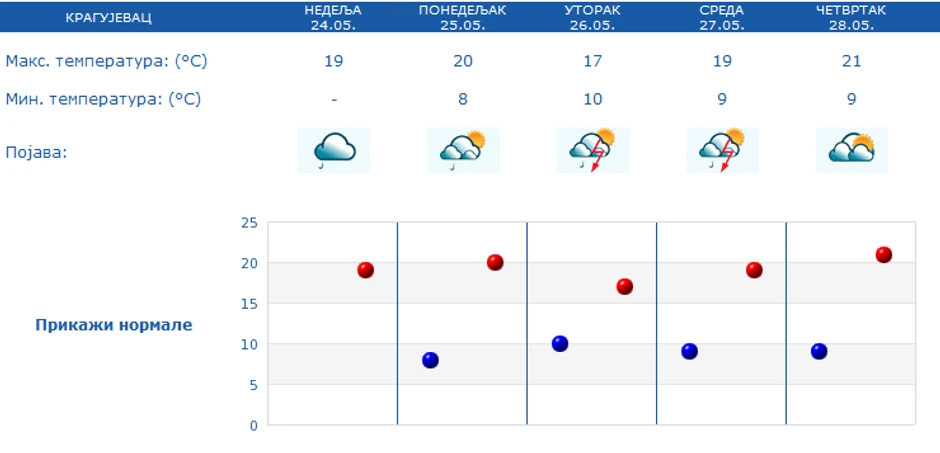 I narednih dana očekuju se pljuskovi sa grmljavinom, najviša jutarnja temperatura biće od 9 stepeni, dok najviša dnevna kretaće se oko 22 podeoka.