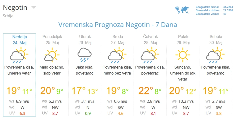 Kiša neće zaobići ni istočni deo zemlje, pa se tako u Negotinu danas očekuju nekoliko pljuskova i oluja sa grmljavinom, a najviša dnevna temperatura biće 18 stepeni.