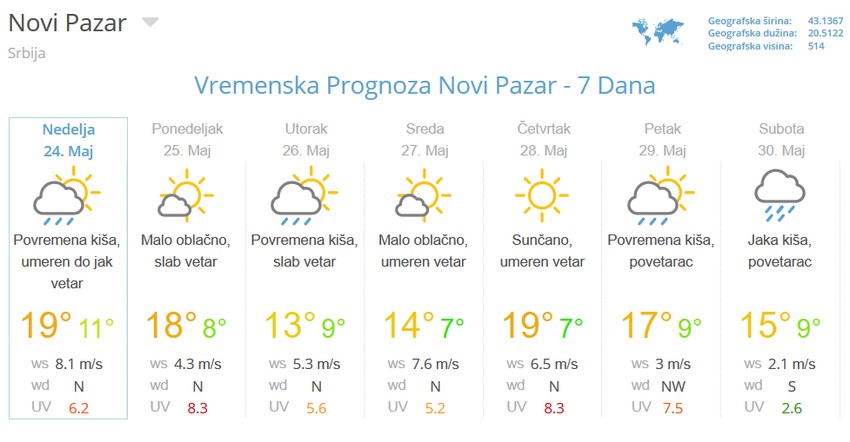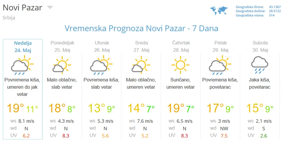 U Novom Pazaru danas je osvanulo prohladno i kišovito jutro, a najviša dnevna temperatura biće 15 stepeni.