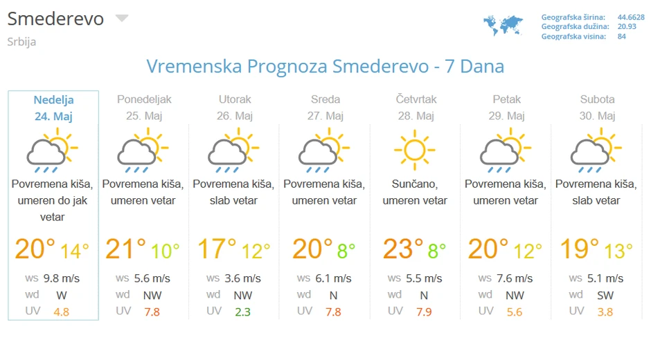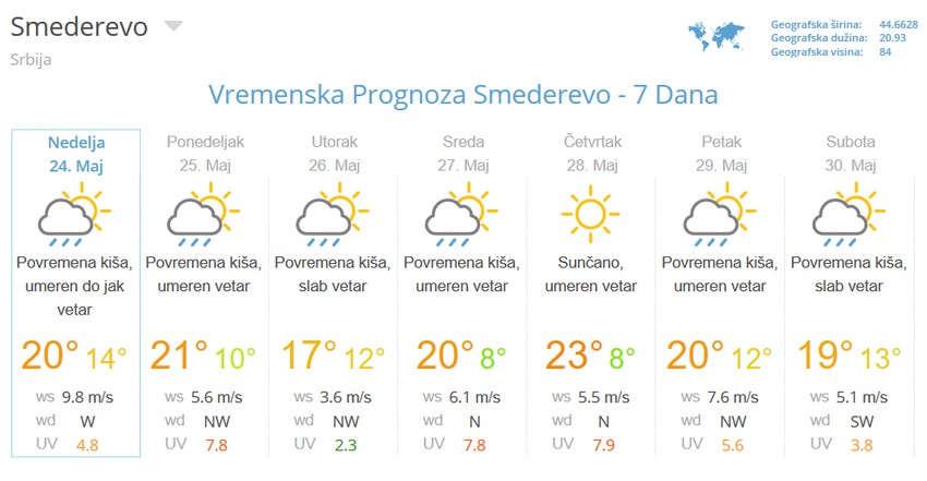 U Smederevu se danas očekuje temperatura od 8 do 19 stepeni, sa nekoliko pljuskova i oluja sa grmljavinom.