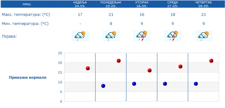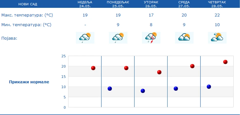 Narednih dana biće nešto toplije vreme, sa najvišom temperaturom do 24 stepeni, koliko se očekuje u četvrtak.