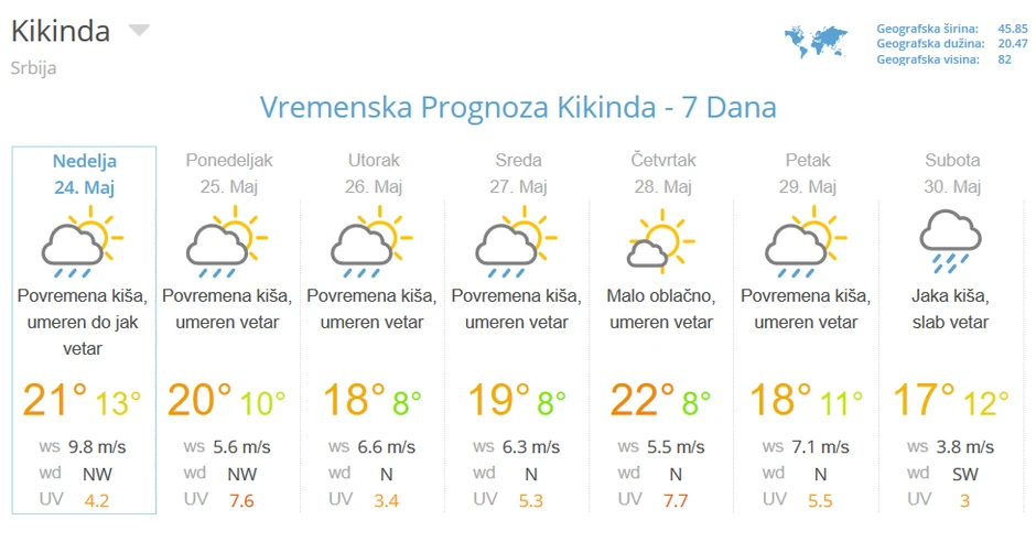 Kiša se očekuje i početkom sledeće nedelje, a pljuskovi se prognoziraju za utorak i sredu. Najviša dnevna temperatura narednih dana biće oko 20 stepeni, a u četvrtak se očekuje stabilizacija vremena i promenljivo oblačno vreme, sa temperaturom do 21 stepen.