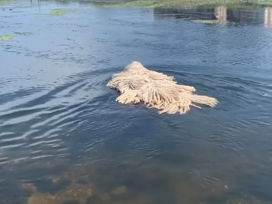 Dok Hanga pliva, njeno krzno se širi na sve strane, pa izgleda kao da je deo tapiserije ili mop za brisanje poda.