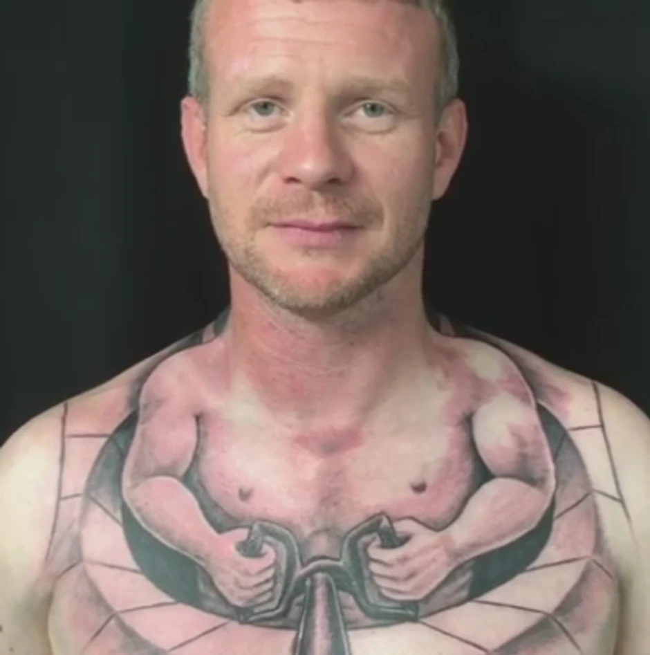 Keni je istetovirao čovečuljka koji vozi njegovo telo. I zaista kada se pokreće i kada mišići rade, izgleda kao da je čovečuljak "vozi" Kenija. Zvuči neobično, ali kada pogledate video biće vam jasno: